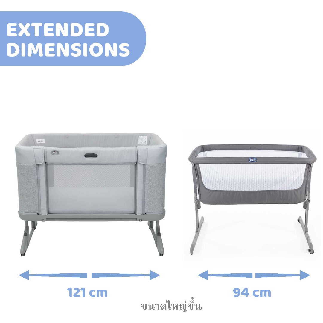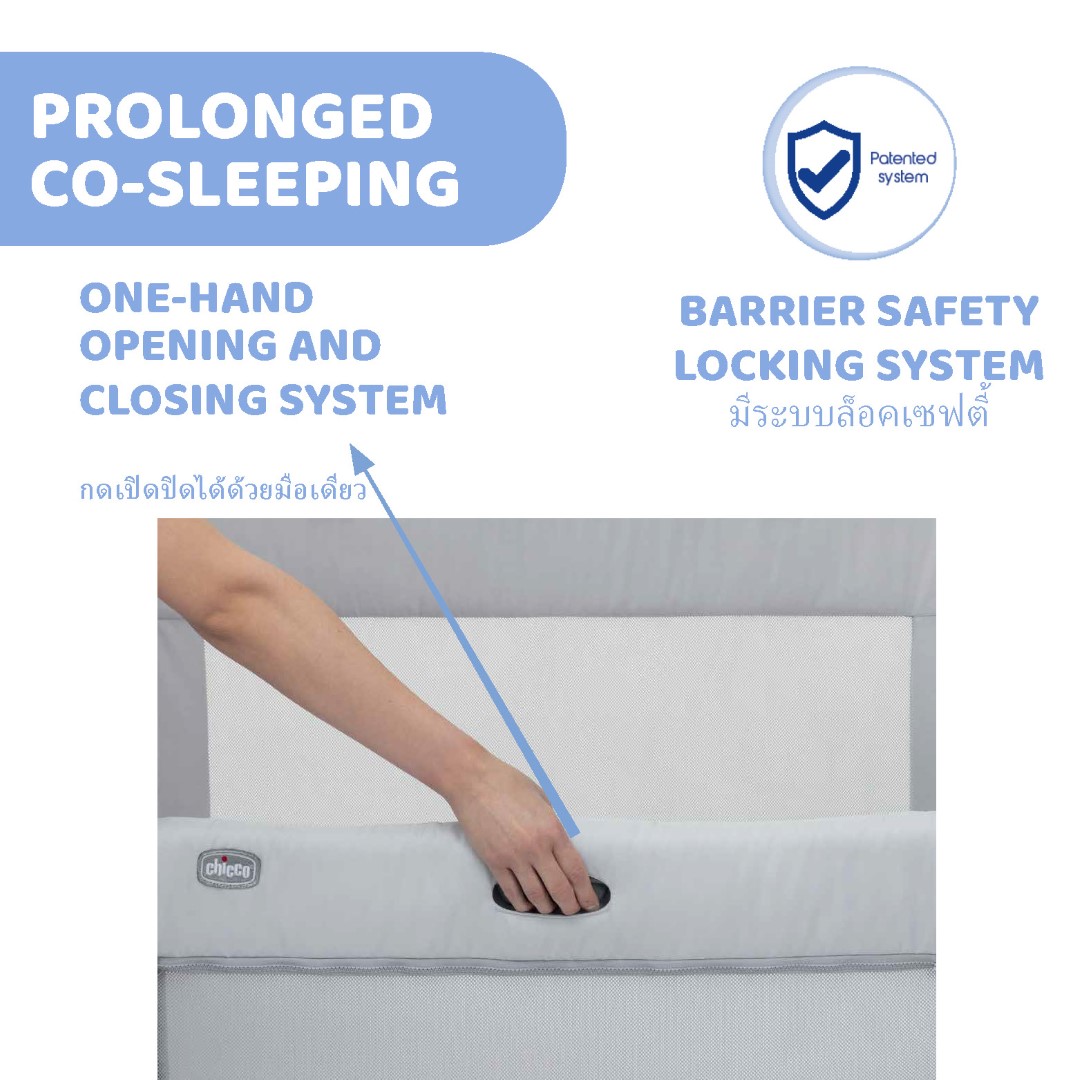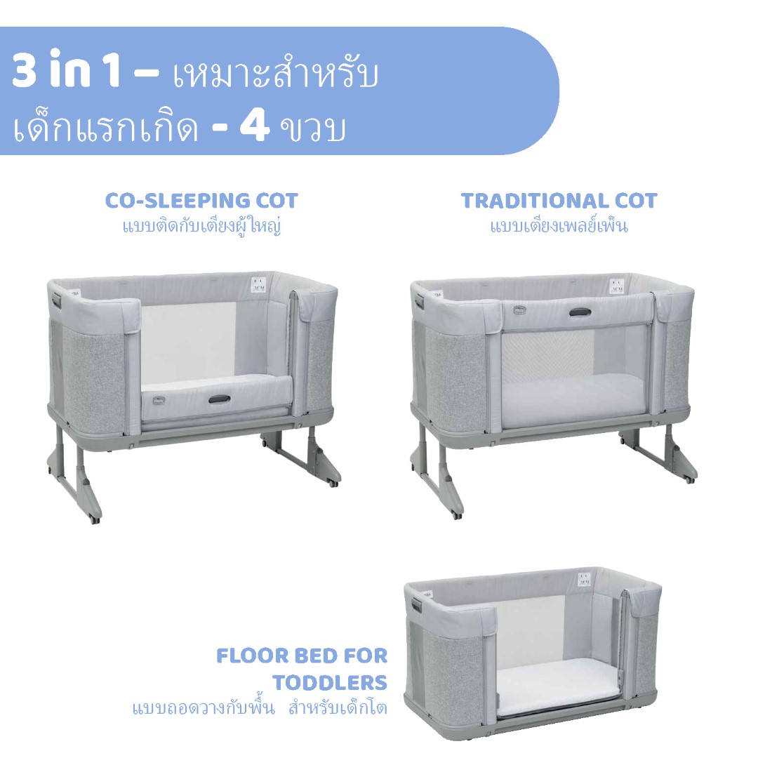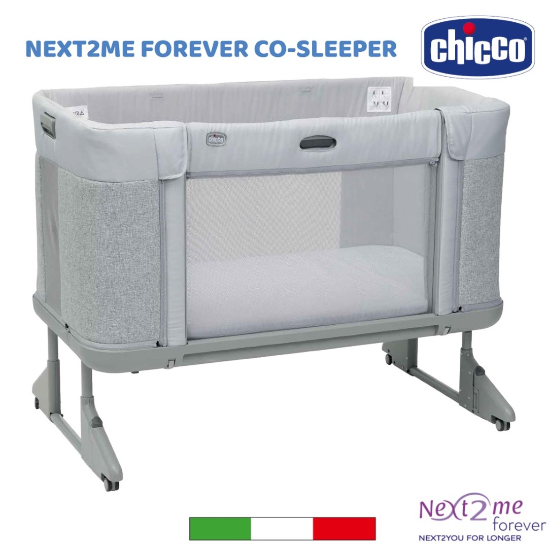 Chicco Next2Me Forever เตียงนอนเด็ก 3 in 1 ใช้งานได้ยาวนาน ตั้งแต่ทารกวัยแรกเกิดถึง 4 ขวบ เพื่อให้ลูกน้อยนอนหลับสบายและปลอดภัยสูงสุด ด้วยคุณสมบัตรพิเศษของรุ่นนี้ได้มีรับการจดสิทธิบัตร ให้ผลิตภัณฑ์เพียงชิ้นเดียวที่สามารถใช้งานได้ถึง 3 แบบ และปรับสูงต่ำได้ตามต้องการ ได้แก่ สามารถเปิดด้านข้างเพื่อตั้งข้างเตียงผู้ปกครองได้ สามารถเป็นเตียงนอนเด็กโดยมีที่กันรอบข้าง และสามารถถอดขาเตียงเพื่อวางบนพื้นเหมาะสำหรับเด็กวัยหัดเดิน