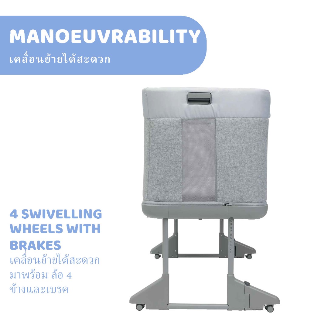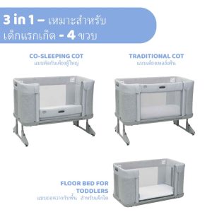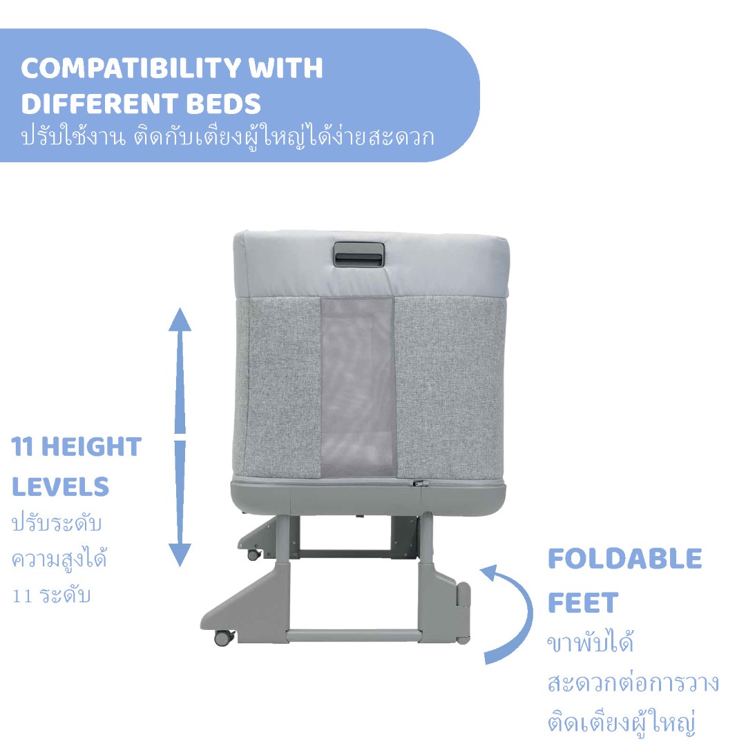 • สามารถปรับเชื่อมเข้ากับเตียงผู้ปกครองที่เป็นขาตั้งเพื่อไม่ให้เหลือช่องว่างและปลอดภัดสำหรับเด็ก