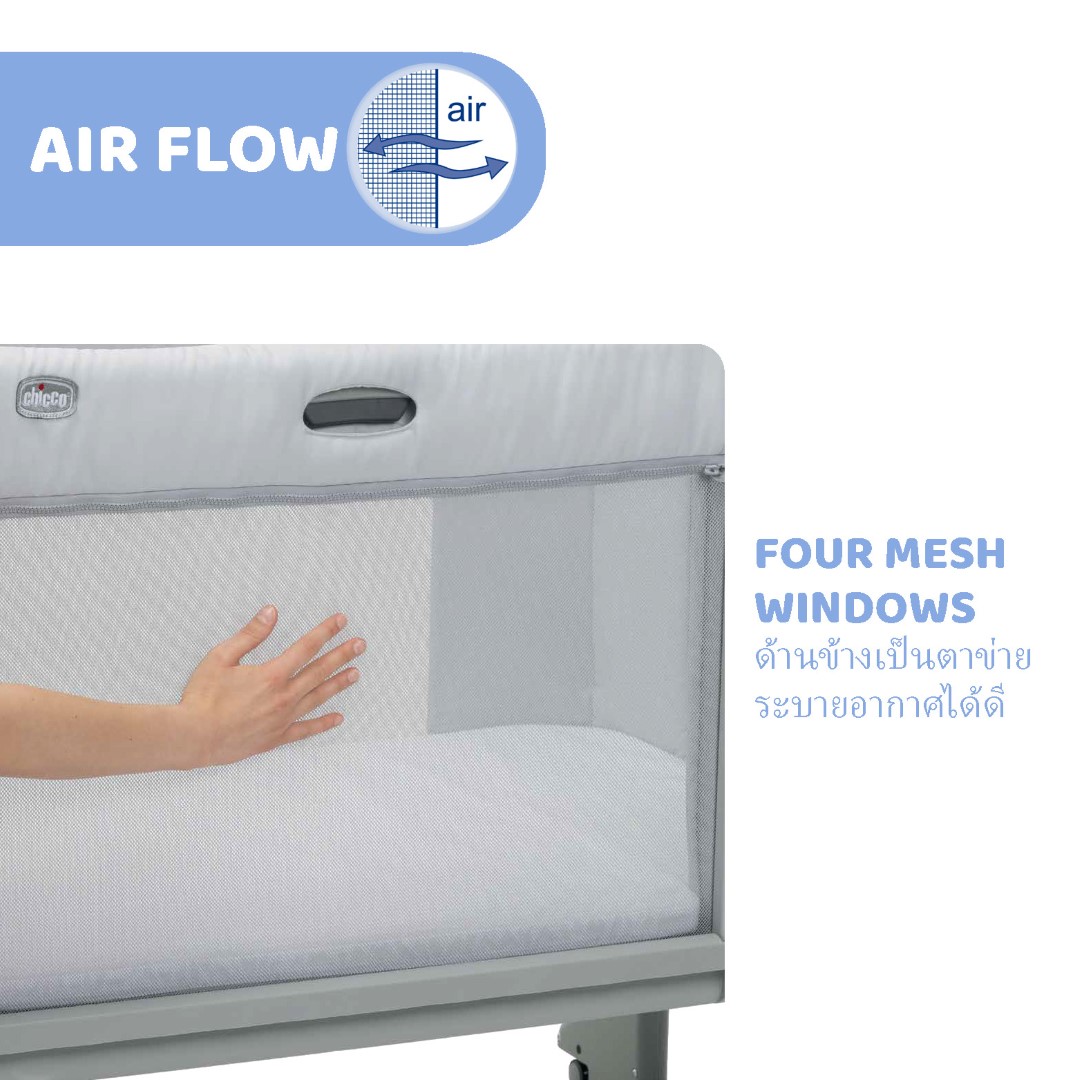• Air circulation: Mesh windows on the 4 walls of the cradle to promote air circulation inside the bed.